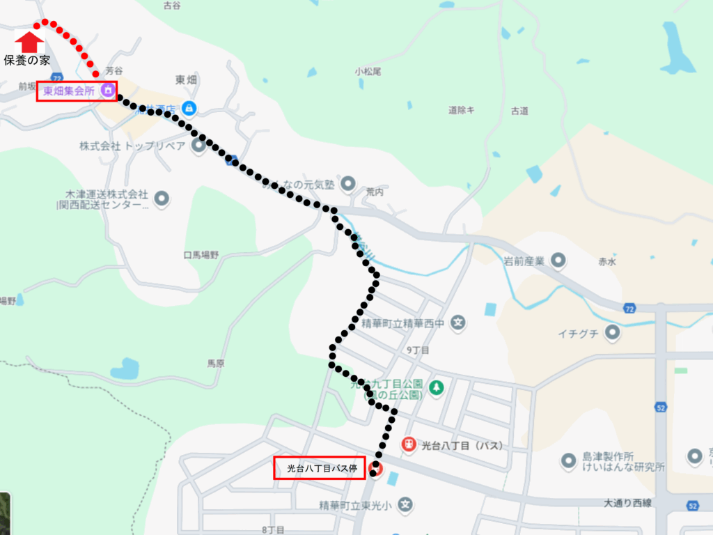 精華町デマンドバス(事前に登録・予約が必要)は、東畑集会所下車徒歩5分
